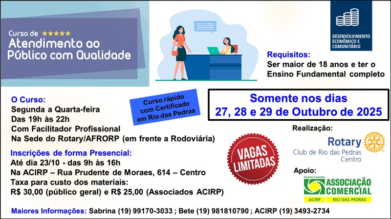 Inscrições de forma presencial na ACIRP até dia 23 de outubro.